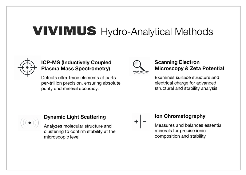 These techniques confirm that every drop of Vivimus is free from organic and inorganic impurities, structurally stable, and electrolytically balanced — achieving pharmaceutical-grade verification unmatched by any bottled water brand.